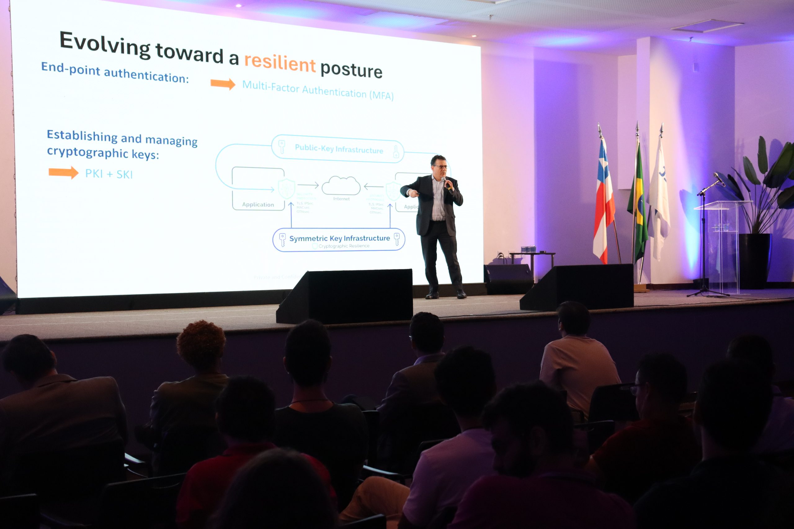 O destaque do encontro foi a palestra do pesquisador canadense Michele Mosca, com o tema “Designing for Cryptographic Resilience”. Durante sua apresentação, Mosca chamou atenção para o avanço das ameaças digitais em um contexto de computação quântica e inteligência artificial: “É muito importante estarmos seguros contra as ameaças conhecidas que se aproximam, assim como sermos resilientes diante de ataques inesperados. A segurança Quantum Safe é essencial para proteger os empregos atuais e futuros”.